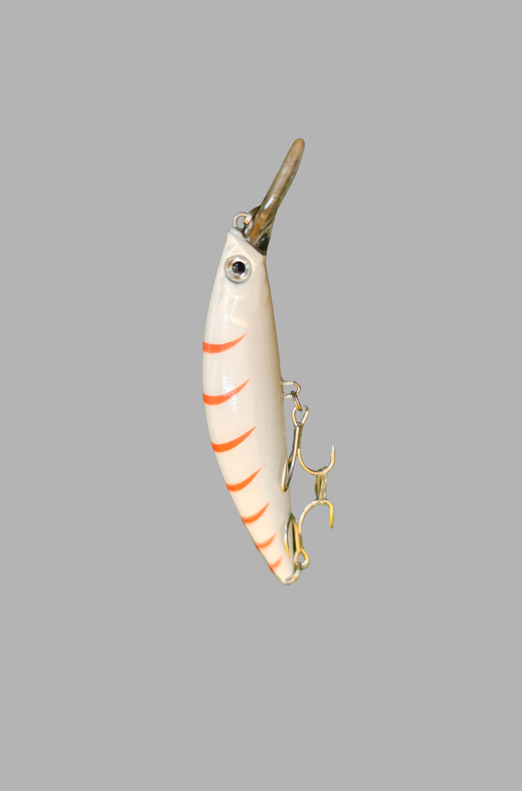 This deep diving minnow lure is designed to target predatory fish in deeper water zones with precision and effectiveness. Featuring a sleek, elongated body with a glow white finish and high-contrast orange stripe pattern, it enhances visibility and mimics injured baitfish to trigger aggressive strikes.