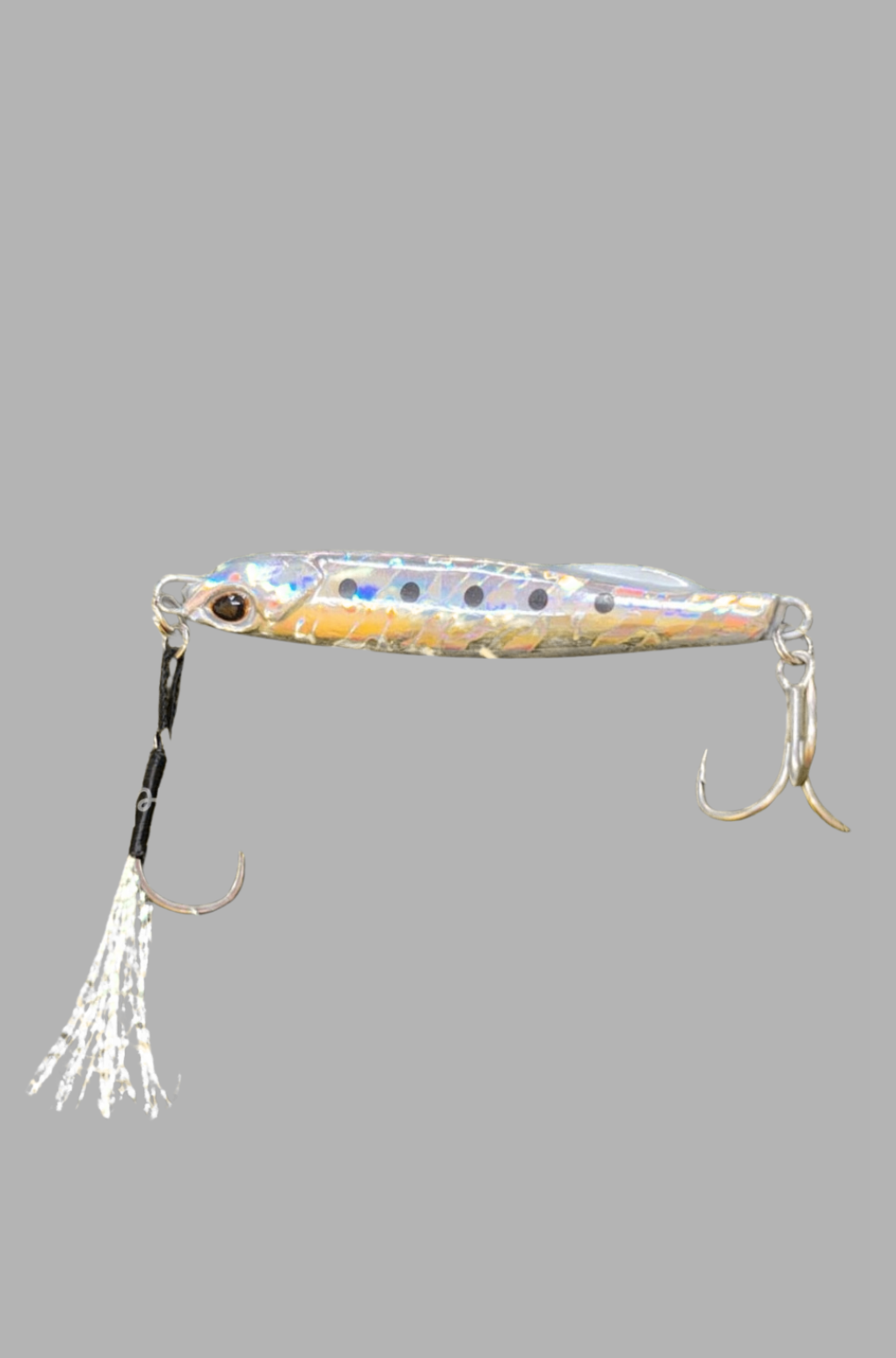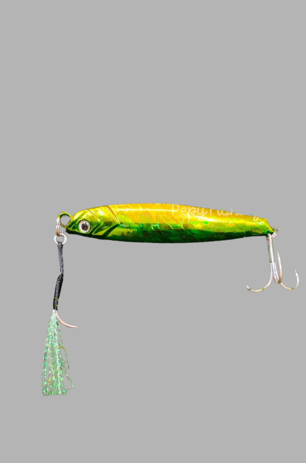 This high-performance metal jig lure is designed to attract a wide range of predatory fish in both saltwater and freshwater environments. Featuring a vibrant holographic finish with a lifelike fish pattern, it reflects light brilliantly underwater to mimic the flash of real baitfish.