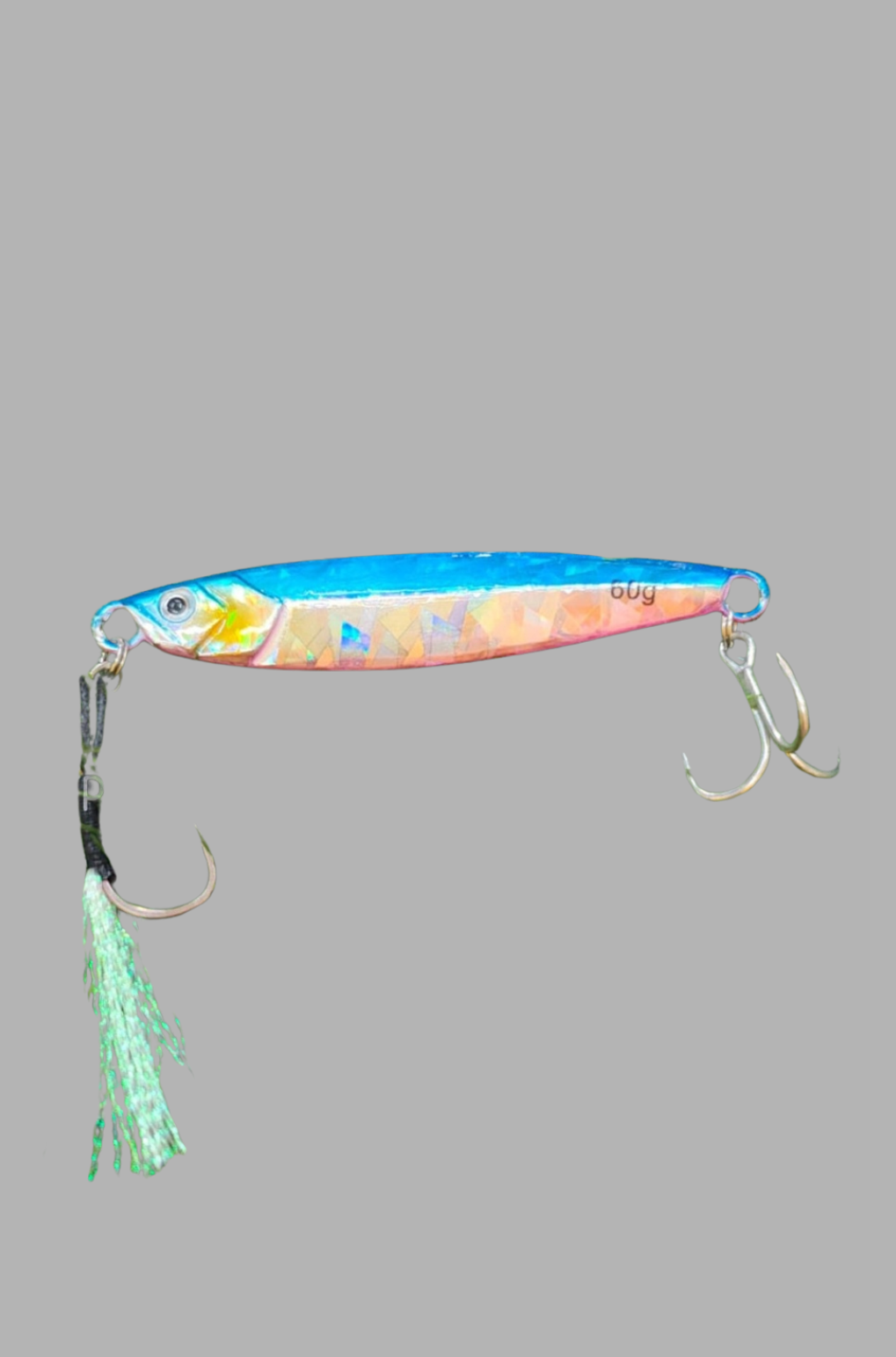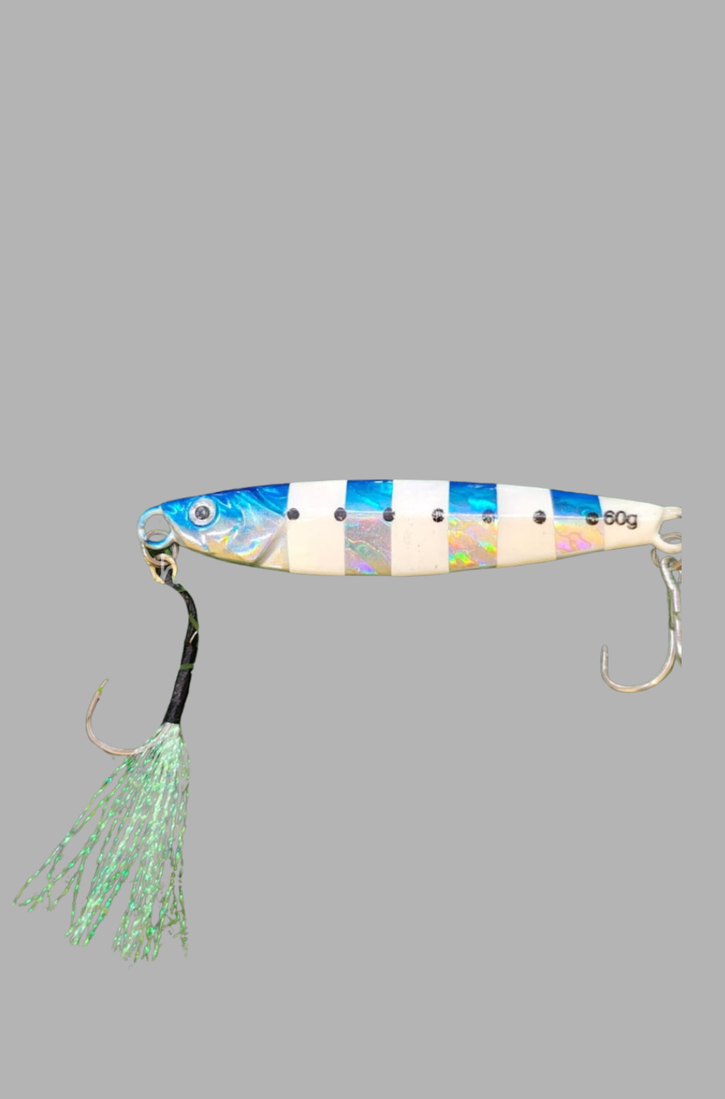 The lure is equipped with durable double hooks for increased hook-up rates, including a rear assist hook with a feather teaser that adds extra movement and attraction. Its streamlined, weighted body (60g) allows for long casting distances and fast sinking, making it ideal for vertical jigging or shore casting.