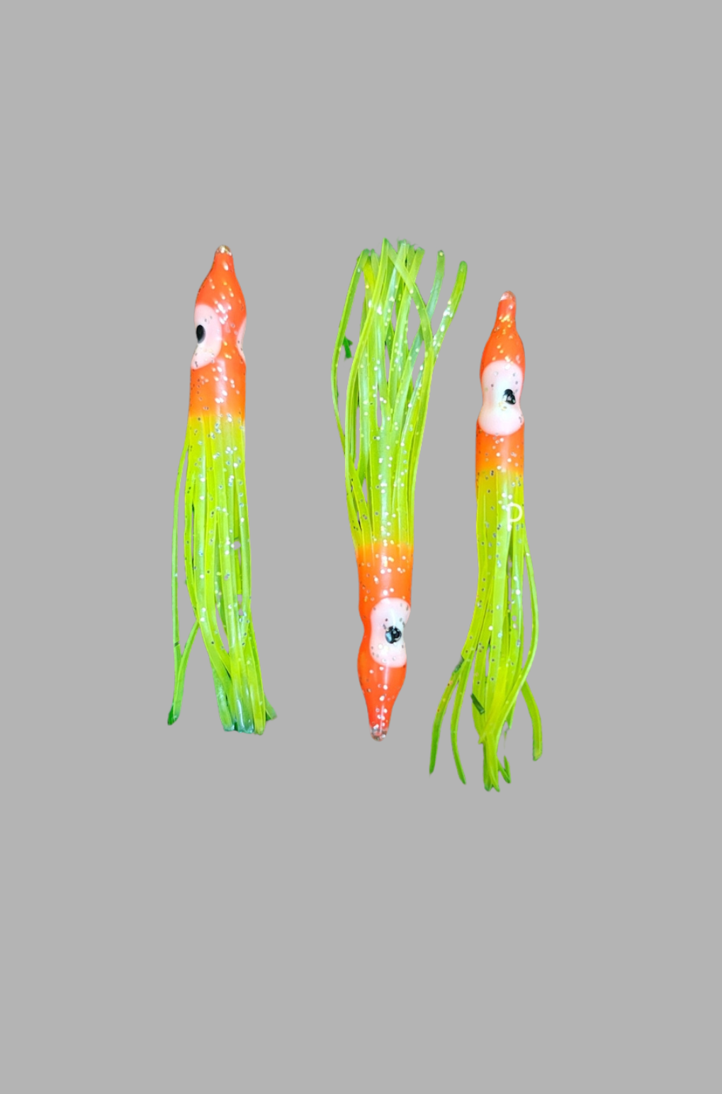 These soft octopus skirt lures are designed to imitate squid or small octopus, making them highly effective for attracting predatory fish in both saltwater and freshwater. The vibrant orange head combined with chartreuse tentacles creates strong visual contrast, while the glow effect enhances visibility in deep or low-light conditions.