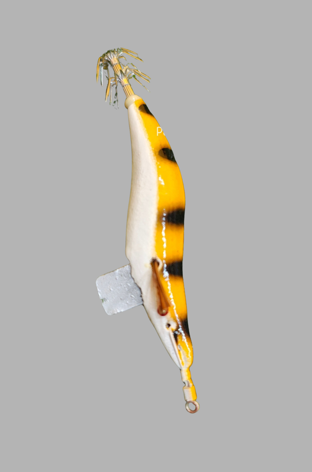 This tiger stripe squid jig lure is specially designed for effective squid and cuttlefish fishing. Featuring a highly visible yellow, white, and black striped pattern, it mimics natural prey and attracts squid even in low-light or murky water conditions.