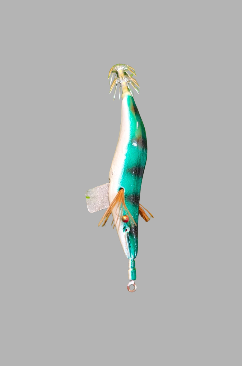 The lure is equipped with a sharp double crown hook system at the tail, ensuring a strong and secure grip when squid strike. Its balanced body and weighted design allow for a natural sinking action and lifelike movement in the water, making it highly effective for eging techniques.